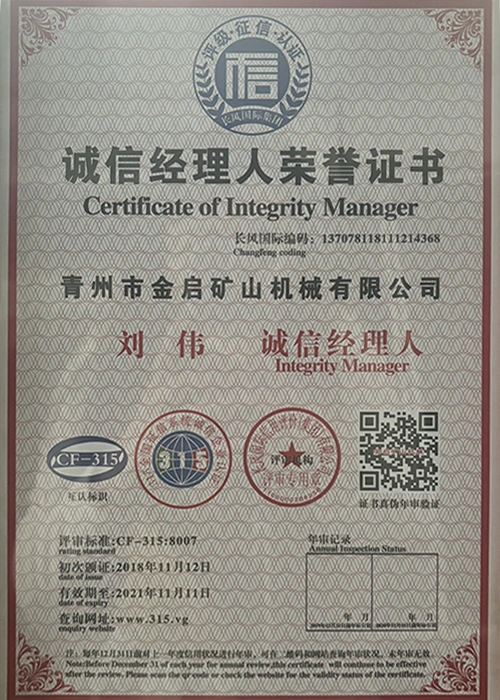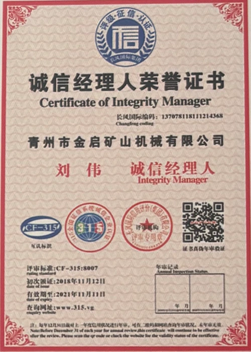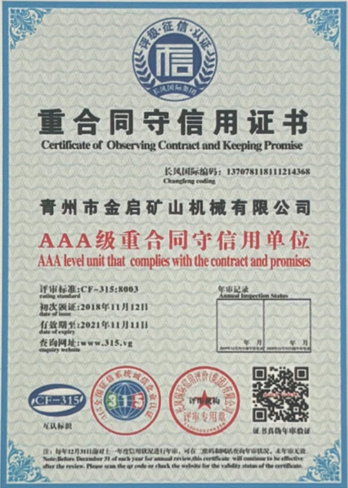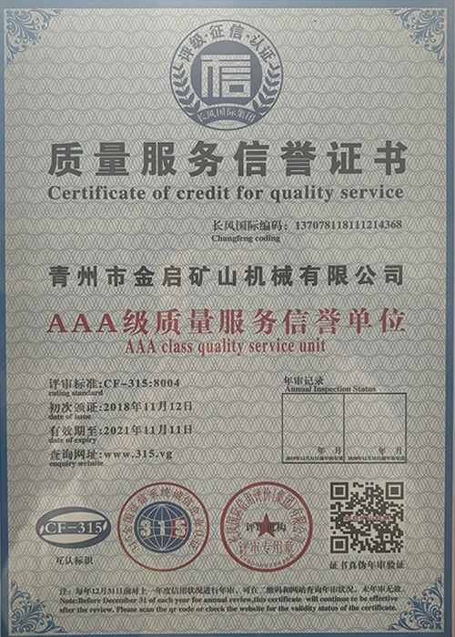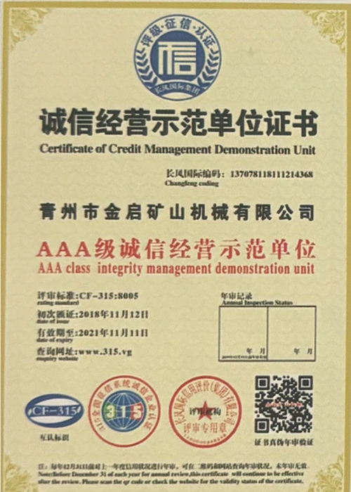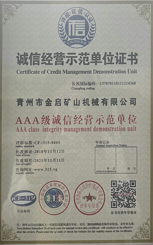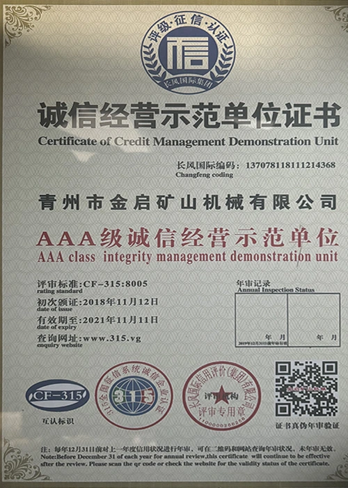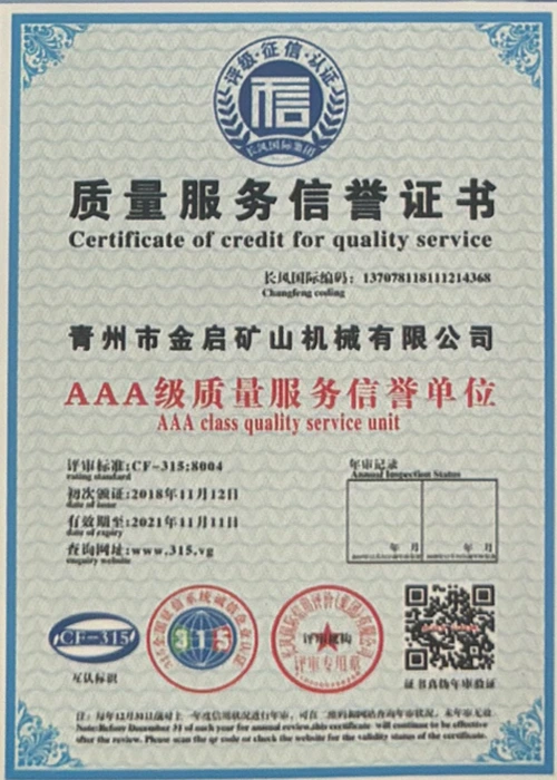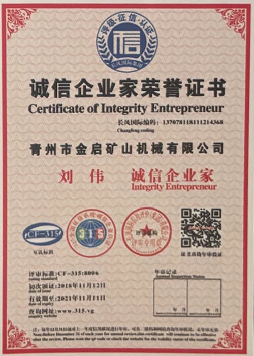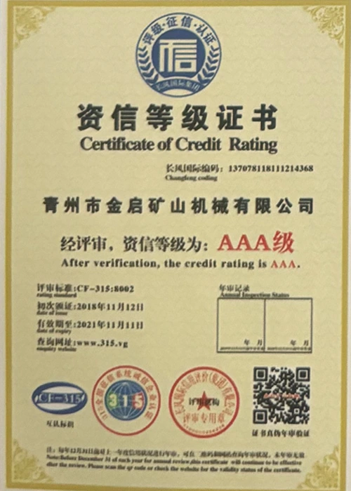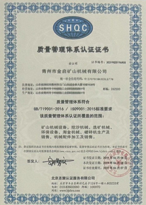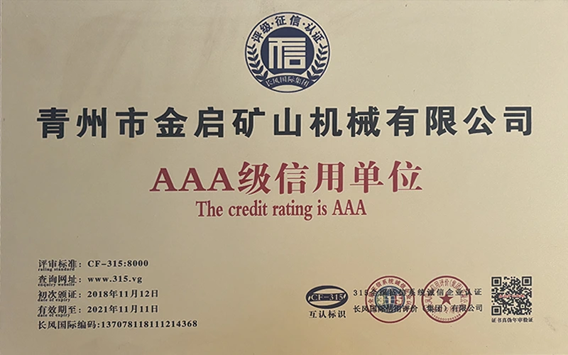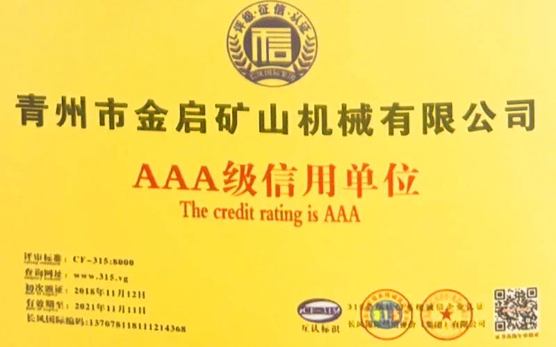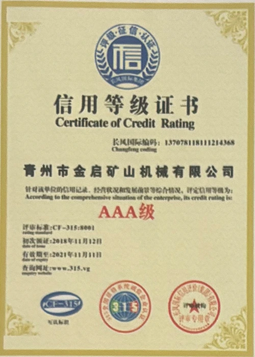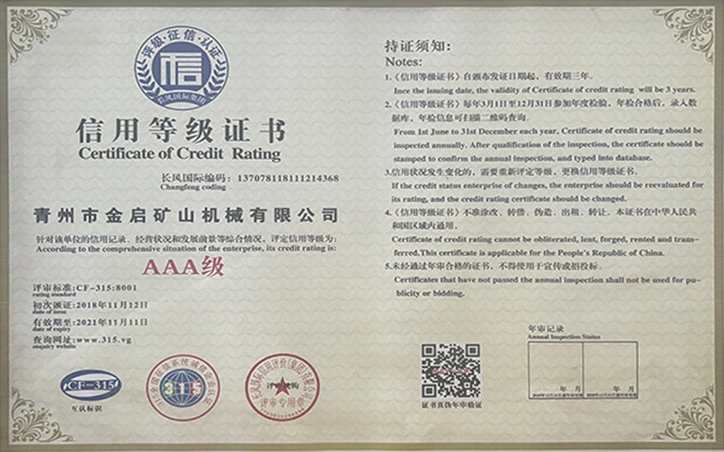Az iparágban szerzett több éves tapasztalattal, a szigorú minőség-ellenőrzésre és a folyamatos technológiai innovációra támaszkodva a vállalat számos hiteles minősítést, tanúsítványt és szabadalmi tanúsítványt szerzett, beleértve az ISO minőségirányítási rendszer tanúsítását, a bányászati termékbiztonsági tanúsítványt, valamint számos találmányi szabadalmat és használati minta szabadalmat a berendezések szerkezetének optimalizálására és energiatakarékos technológiai garanciára, komplett műszaki korszerűsítésre és gyártási erősség demonstrálására.