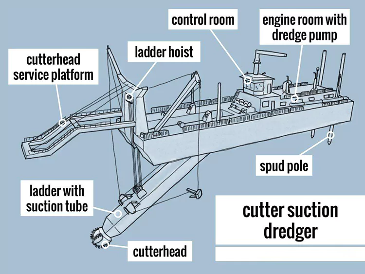 Alapszerkezetei közé tartozik egy vágórendszer, egy szívó- és nyomórendszer, egy pozicionáló és átmenő rendszer, valamint egy energiaellátó rendszer, amely lehetővé teszi az integrált "kitermelési-szállítási-kirakodási" műveleteket. Széles körben használják folyami kotrási és rekultivációs projektekben.